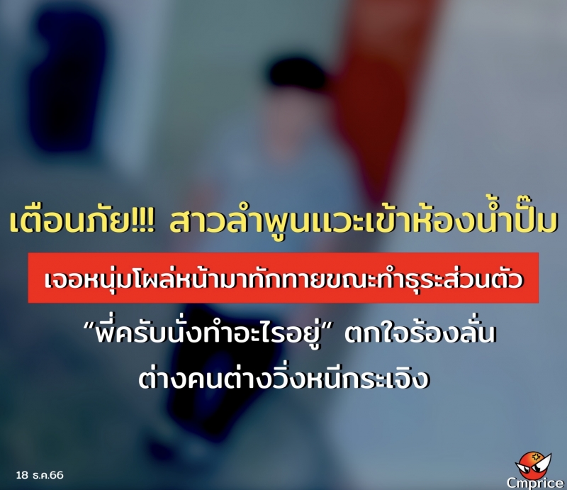 เมื่อวันที่ 18 ธันวาคม 2566 เวลาประมาณ 12.20 น. มีหญิงสาวชาวลำพูนได้แวะเข้าห้องน้ำที่ปั๊มน้ำมันแห่งหนึ่ง แถว ต.เหมืองง่า อ.เมือง จ.ลำพูน โดยขณะที่เธอเดินเข้าไปในห้องน้ำ ได้พบผู้ชายอายุประมาณ20-30ปี อยู่ในห้องน้ำผู้หญิง ทีแรกก็ตกใจ คิดว่าเขาคงเข้าห้องน้ำผิด เลยวิ่งมาดูป้ายที่หน้าห้องน้ำใหม่ ก็เห็นว่าเป็นห้องน้ำหญิงถูกต้อง จากนั้นเธอก็ยังคิดแบบโลกสวย ว่าคงไม่เป็นไร เขาน่าจะเป็นพนักงานทำความสะอาด เพราะเขาเดินวนเข้าๆออกๆ ห้องน้ำห้องสุดท้ายในห้องน้ำผู้หญิง เธอจึงเข้าห้องน้ำทำธุระตามปกติ สักพักเธอรู้สึกเหมือนมีอะไรมาแกว่งโดนที่เท้า ก็ตกใจและขุ่นใจนิดๆว่าทำไมพนักงานทำความสะอาดไม่สุภาพเลย อีกแป๊บเดียว ก็เจอผู้ชายคนนั้น เอาหน้าสอดเข้ามาตรงช่องว่างด้านล่าง แล้วแหงนหน้ามาถามว่า “พี่ครับ นั่งทำอะไรอยู่ครับ” ถึงกับตกใจ ร้องลั่น ผู้ชายคนนั้นก็ตกใจเช่นกัน ต่างคนต่างวิ่งกระเจิงออกไปนอกออกห้องน้ำ