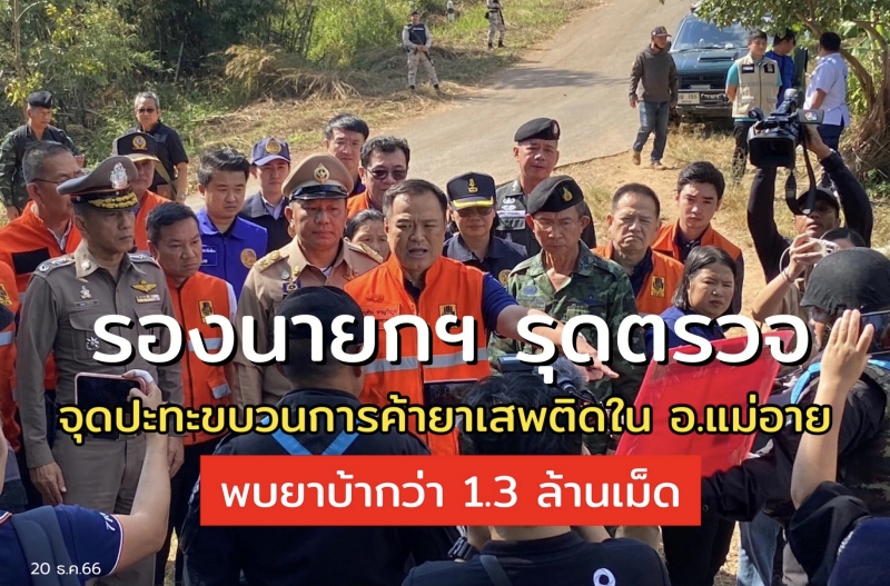 รองนายกรัฐมนตรีและรัฐมนตรีว่าการกระทรวงมหาดไทย ลงพื้นที่ตรวจจุดปะทะขบวนการค้ายาเสพติดลักลอบเข้าไทยในพื้นที่ อ.แม่อาย จ.เชียงใหม่ เช้ามืดที่ผ่านมา พบยาบ้ากว่า 1.3 ล้านเม็ด ลั่นทุกฝ่ายต้องบูรณาการร่วมกันป้องกันอย่างเต็มที่