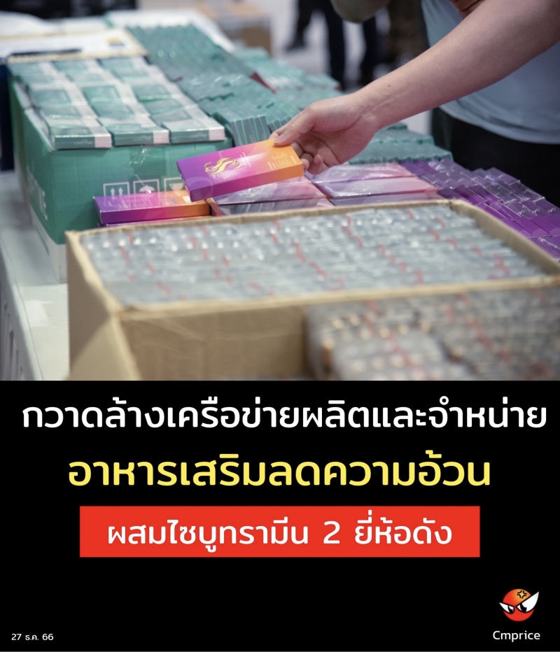 อย. ร่วม ตำรวจสอบสวนกลาง (CIB) กวาดล้างเครือข่ายผลิตและจำหน่าย อาหารเสริมลดความอ้วนผสมไซบูทรามีน 2 ยี่ห้อดัง มูลค่ากว่า 7 ล้านบาท
