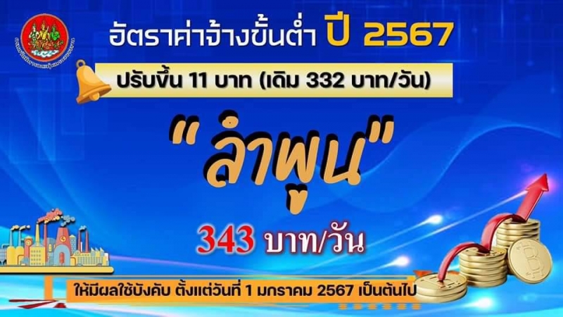 ลำพูน ปรับอัตราค่าจ้างขั้นต่ำเป็น 343 บาท/วัน  ให้มีผลใช้บังคับ 1 มกราคม 2567 เป็นต้นไป