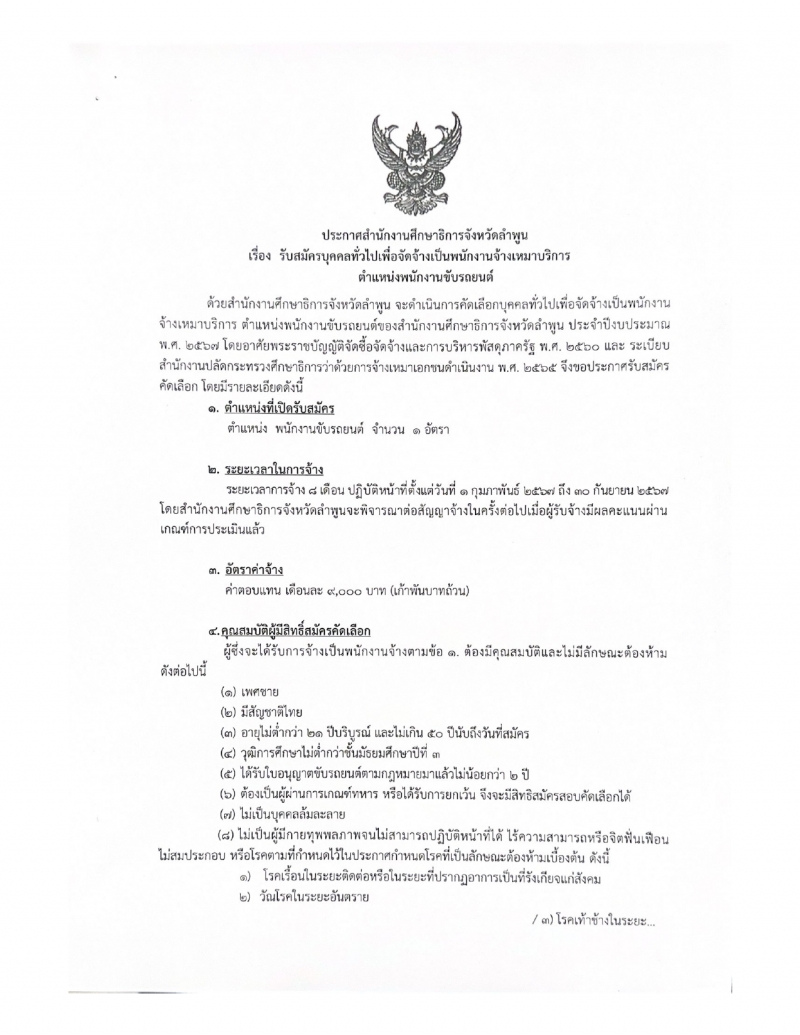 สนง.ศึกษาธิการลำพูน รับสมัครพนักงานขับรถ ถึง18ม.ค.67