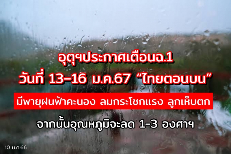 | • อุตุฯประกาศเตือนฉ.1 วันที่ 1316 ม.ค.67 ไทยตอนบน มีพายุฝนฟ้าคะนอง ลมกระโชกแรง ลูกเห็บตกจากนั้นอุณหภูมิจะลด 1-3 องศาฯ |