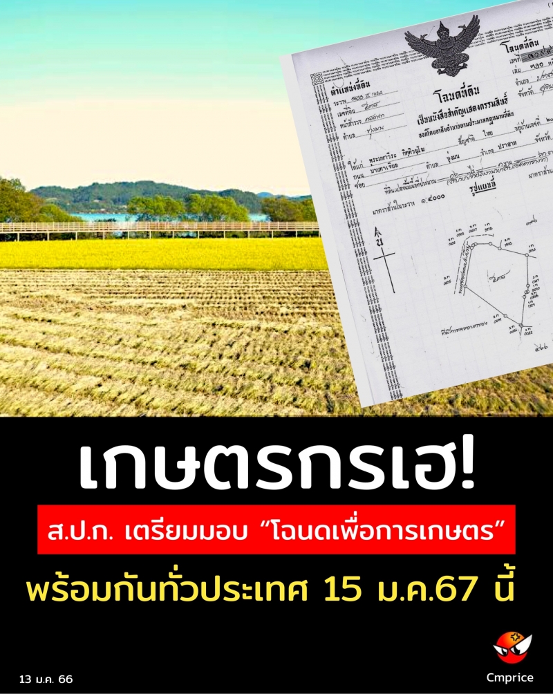 กระทรวงเกษตรฯ โดย ส.ป.ก. เตรียม Kick off การมอบโฉนดเพื่อการเกษตร เป็นของขวัญปีใหม่ พ.ศ. 2567 วันที่ 15 ม.ค. 2567 นี้ พร้อมกันทั่วประเทศ ซึ่งจากการแถลงนโยบายของรัฐบาล เมื่อวันที่ 11 กันยายน 2566 ที่นำมาสู่การขับเคลื่อนนโยบายที่จะเปลี่ยนหนังสืออนุญาตให้เข้าทำประโยชน์ในเขตปฏิรูปที่ดิน (ส.ป.ก. 4-01) เป็นโฉนดเพื่อการเกษตร ซึ่งมีเป้าหมายในการปรับปรุงและพัฒนาสิทธิในที่ดินของรัฐบาล โดยสิทธิประโยชน์ที่เกษตรกรจะได้รับจากโฉนดเพื่อการเกษตร มีดังนี้ 1. เปลี่ยนมือได้ (โอนสิทธิ) สามารถโอนคืน ส.ป.ก. ได้ โดยโอนคืนให้ ส.ป.ก.ทั้งแปลงหรือบางส่วนได้ โดยได้รับค่าชดเชย หากเกษตรกรไม่ประสงค์ประกอบอาชีพเกษตรกรรม สามารถสละสิทธิให้เกษตรกรอื่นที่มีคุณสมบัติตามกำหนด โดยสามารถเปลี่ยนมือให้แก่เกษตรกรอื่นที่มีคุณสมบัติตาม ส.ป.ก. กำหนด 2. เพิ่มวงเงินสินเชื่อ การเข้าถึงแหล่งทุนใหม่ สามารถเป็นหลักทรัพย์ค้ำประกันได้ โดยขยายวงเงินสินเชื่อให้กับเกษตรกรที่ขอกู้กับ ธ.ก.ส. หรือใช้ไม้มีค่าที่ปลูกบนที่ดิน ค้ำประกันสินเชื่อให้เต็มวงเงิน 100% และสามารถขอสินเชื่อนโยบายจากกองทุน ส.ป.ก. เต็มวงเงินตามราคาประเมินที่ดินของกรมธนารักษ์นอกจากนั้นยังเพิ่มแหล่งสินเชื่อใหม่ โดยการเจรจากับกรมส่งเสริมสหกรณ์ชุมนุมสหกรณ์ สถาบันการเงินของรัฐ และสถาบันการเงินอื่น 3. สามารถใช้ค้ำประกันตัวบุคคล โดยเป็นหลักทรัพย์ประเภทหนึ่งที่สามารถค้ำประกันตัวบุคคลทั้งในชั้นสอบสวนและชั้นศาล โดยความร่วมมือกับกระทรวงยุติธรรมและสำนักงานตำรวจแห่งชาติ 4. สร้างรายได้ให้เกษตรกร เพิ่มทรัพย์สินโดยส่งเสริมการปลูกไม้มีค่า 10 ต้นต่อไร่ ซึ่งสามารถใช้ต้นไม้ค้ำประกันสินเชื่อ (โฉนดต้นไม้) และขาย Carbon Credit โดยความร่วมมือกับ กรมป่าไม้, ธ.ก.ส. และ อบก. และ 5. ได้รับการส่งเสริมและพัฒนาจากรัฐในด้านโครงสร้างพื้นฐาน สาธารณูปโภค ซึ่งมีการทำ MOU 16 หน่วยงาน ด้านการพัฒนาอาชีพ และรับเงินชดเชยหรือเยียวยาภัยพิบัติ