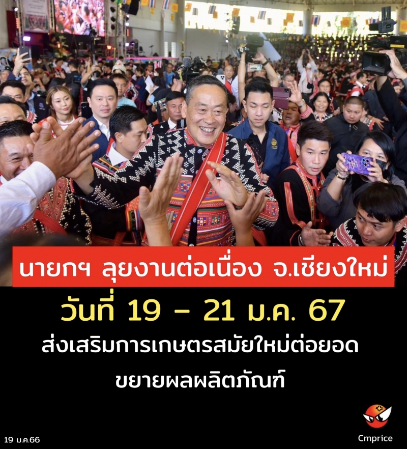 | • นายกฯ ลุยงานต่อเนื่อง จ.เชียงใหม่ ระหว่างวันที่ 19 21 ม.ค.67 ส่งเสริมการเกษตรสมัยใหม่ต่อยอดขยายผลผลิตภัณฑ์ |