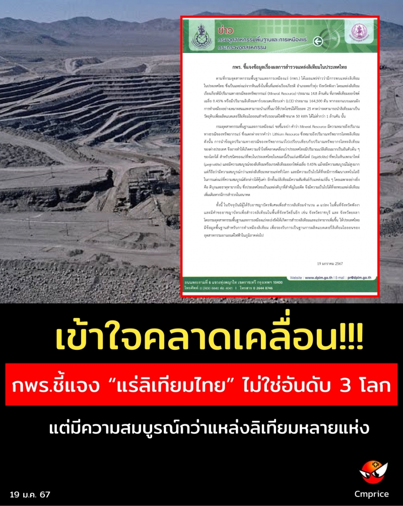 | • เข้าใจคลาดเคลื่อน!!! กพร.ชี้แจง แร่ลิเทียมไทย ไม่ใช่อันดับ 3 ของโลกโลก แต่มีความสมบูรณ์กว่าแหล่งลิเทียมหลายแห่ง |