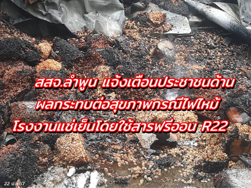 จากกรณีเหตุการณ์ไฟไหม้โรงงานแช่เย็นในเขตตำบลมะเขือแจ้อำเภอเมืองลำพูน จังหวัดลำพูน เมื่อวันที่ 21 มกราคม 2567ซึ่งพบว่าไฟไหม้ห้องแช่เย็นหรือแช่แข็งผลผลิตทางการเกษตรโดยใช้สารฟรีออน R22 หรือสารคลอโรได่ฟลูออโรมีเธนเป็นองค์ประกอบหลักในการใช้ทำความเย็น ตัวสารดังกล่าวไม่ติดไฟ แต่ช่วยสนับสนุนการเกิดเพลิงไหม้