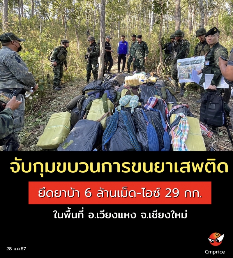 กกล.ผาเมือง จับกุมขบวนการขนยาเสพติด ยึดยาบ้า 6,000,000 เม็ด และยาไอซ์ 29 กิโลกรัม ในพื้นที่ อ.เวียงแหง จ.เชียงใหม่