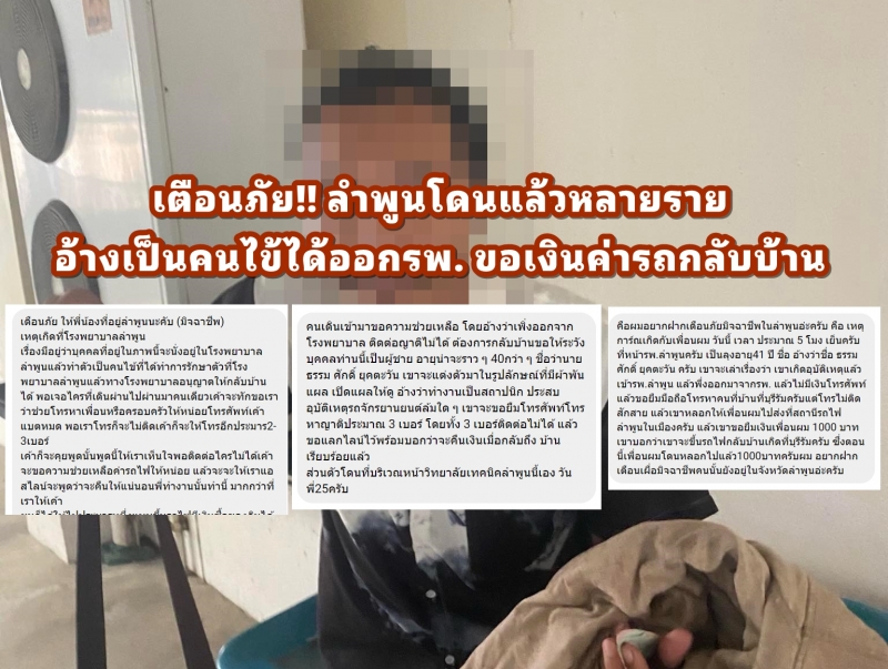 30 ม.ค.67- รับแจ้งจากชาวลำพูน ว่าพบเจอชายคนหนึ่งที่มีพฤติกรรมเข้าข่ายเป็นมิจฉาชีพ โดยเหตุการณ์นี้เกิดที่โรงพยาบาลลำพูน  หนุ่มลำพูนรายนี้เล่าว่าได้พาภรรยาไปคลอดลูกที่รพ.ลำพูนเมื่อวันเสาร์ที่ 28 ม.ค.67 โดยช่วงเวลาประมาณเกือบห้าโมงเย็นได้พบเจอชายคนหนึ่งชื่อ นายธรรมศักดิ์ (ชื่อตามใบขับขี่) ทำตัวเป็นคนไข้ที่ได้ทำการรักษาตัวที่โรงพยาบาลลำพูนแล้วทางโรงพยาบาลอนุญาตให้กลับบ้านได้ พอเจอใครที่เดินผ่านไปผ่านมาคนเดียว จะทักขอความช่วยเหลือ โทรหาเพื่อนหรือครอบครัวให้หน่อยโทรศัพท์เค้าแบตหมด พอโทรไปก็จะโทรไม่ติด ก็จะให้โทรอีกประมาณ 2-3เบอร์ โดยก็จะคุยพูดเรื่องนั้นเรื่องนี้ไปเรื่อยๆ พูดให้เราเห็นใจพอติดต่อไครไม่ได้เค้าจะขอความช่วยเหลือค่ารถไฟให้หน่อย แล้วจะให้เราแอดไลน์บอกว่าจะคืนให้แน่นอน อ้างว่าตัวเขาทำงานที่นั้นที่นี้ จะคืนเงินให้มากกว่าที่เราให้เค้าไป