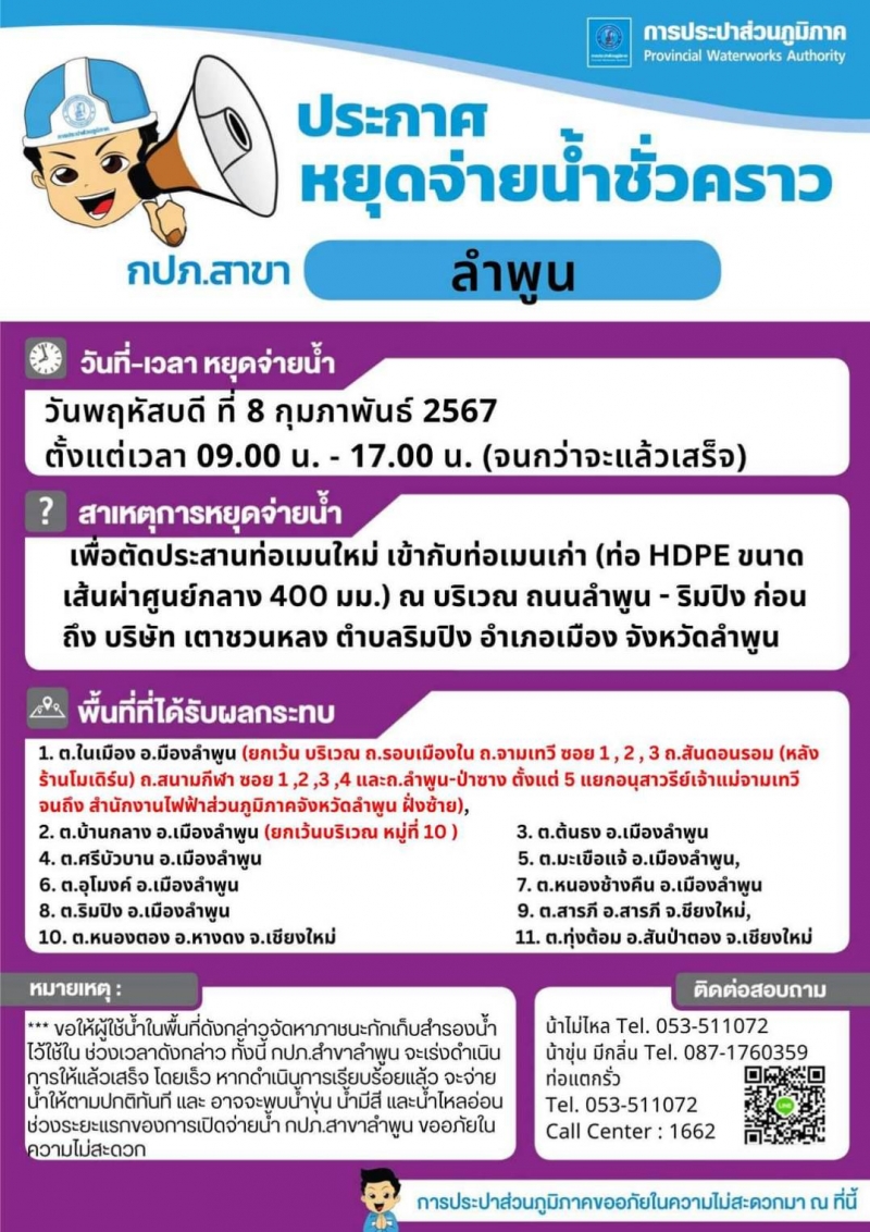 ประกาศแจ้งหยุดจ่ายน้ำในวันพฤหัสบดี ที่ 8 กุมภาพันธ์ 2567 ตั้งแต่เวลา 09.00 น. - 17.00 น. (จนกว่าจะแล้วเสร็จ) กปภ.สาขาลำพูน ขอให้ผู้ใช้น้ำในพื้นที่ดังกล่าวจัดหาภาชนะกักเก็บสำรองน้ำไว้ใช้ใน ช่วงเวลาดังกล่าว