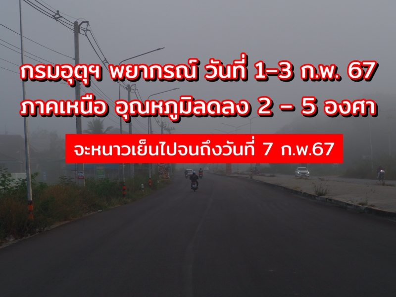 (1 ก.พ. 67) กรมอุตุนิยมวิทยา พยากรณ์อากาศ 24 ชั่วโมงข้างหน้า ลมฝ่ายตะวันตกในระดับบนพัดปกคลุมภาคเหนือ ลักษณะเช่นนี้ทำให้บริเวณดังกล่าวมีอุณหภูมิลดลง สำหรับบริเวณความกดอากาศสูงหรือมวลอากาศเย็นกำลังปานกลางที่ปกคลุมประเทศไทยและทะเลจีนใต้อ่อนกำลังลง ลักษณะเช่นนี้ทำให้ภาคตะวันออกเฉียงเหนือ และภาคตะวันออกมีอุณหภูมิสูงขึ้น แต่ยังคงมีอากาศเย็นกับมีหมอกในตอนเช้า ในขณะที่มีลมใต้และลมตะวันออกเฉียงใต้พัดปกคลุมประเทศไทยตอนบน ทำให้บริเวณดังกล่าวมีฝนบางแห่งขอให้ประชาชนในบริเวณดังกล่าวดูแลรักษาสุขภาพเนื่องจากสภาพอากาศที่เปลี่ยนแปลง และระมัดระวังในการสัญจรผ่านบริเวณที่มีหมอกไว้ด้วย