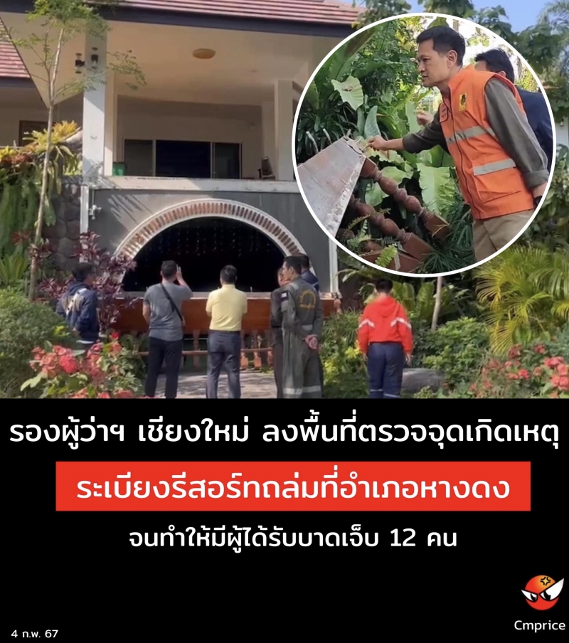 บ่ายวันนี้ (4 ก.พ. 67) นายทศพล เผื่อนอุดม รองผู้ว่าราชจังหวัดเชียงใหม่ ได้ลงพื้นที่ไปตรวจสอบจุดเกิดเหตุระเบียงรีสอร์ถล่มในพื้นที่อำเภอหางดง ซึ่งมีผู้ได้รับบาดเจ็บ 12 ราย โดยมีอาการสาหัส 2 ราย พร้อมกันนี้ ได้เดินทางไปเยี่ยมและให้กำลังใจผู้ได้รับบาดเจ็บที่กำลังรักษาตัวอยู่ที่โรงพยาบาลอำเภอสันป่าตอง จังหวัดเชียงใหม่
