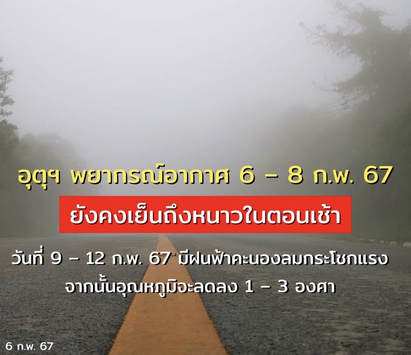 พยากรณ์อากาศ 7 วันข้างหน้า: ในช่วงวันที่ 6 – 8 ก.พ. 67 บริเวณความกดอากาศสูงหรือมวลอากาศเย็นกำลังอ่อนปกคลุมภาคเหนือและภาคตะวันออกเฉียงเหนือ ประกอบกับมีลมฝ่ายตะวันตกในระดับบนพัดปกคลุมภาคเหนือและภาคตะวันออกเฉียงเหนือตอนบน ลักษณะเช่นนี้ทำให้ภาคเหนือและภาคตะวันออกเฉียงเหนือตอนบนยังคงมีอากาศเย็นถึงหนาวในตอนเช้า ในขณะที่ลมใต้และลมตะวันออกเฉียงใต้พัดปกคลุมภาคตะวันออกเฉียงเหนือตอนล่าง ภาคกลางตอนล่าง และภาคตะวันออก ทำให้บริเวณดังกล่าวมีฝนฟ้าคะนองบางแห่ง ส่วนในช่วงวันที่ 9 – 12 ก.พ. 67 บริเวณความกดอากาศสูงหรือมวลอากาศเย็นกำลังปานกลางระลอกใหม่จากประเทศจีนจะแผ่ลงมาปกคลุมด้านตะวันออกของภาคเหนือ ภาคตะวันออกเฉียงเหนือ และทะเลจีนใต้ ประกอบกับมีลมตะวันออกและลมตะวันออกเฉียงใต้พัดปกคลุมภาคตะวันออกเฉียงเหนือตอนล่าง ภาคกลางตอนล่าง รวมทั้งกรุงเทพมหานครและปริมณฑล ภาคตะวันออก และภาคใต้ตอนบน ลักษณะเช่นนี้ทำให้บริเวณดังกล่าวมีฝนฟ้าคะนองกับมีลมกระโชกแรงเกิดขึ้นได้ในระยะแรก หลังจากนั้นอุณหภูมิจะลดลง 2 - 4 องศาเซลเซียสกับมีลมแรงในภาคตะวันออกเฉียงเหนือ ส่วนภาคเหนือ ภาคกลางรวมทั้งกรุงเทพมหานครและปริมณฑล และภาคตะวันออก อุณหภูมิจะลดลง 1 – 3 องศาเซลเซียส
