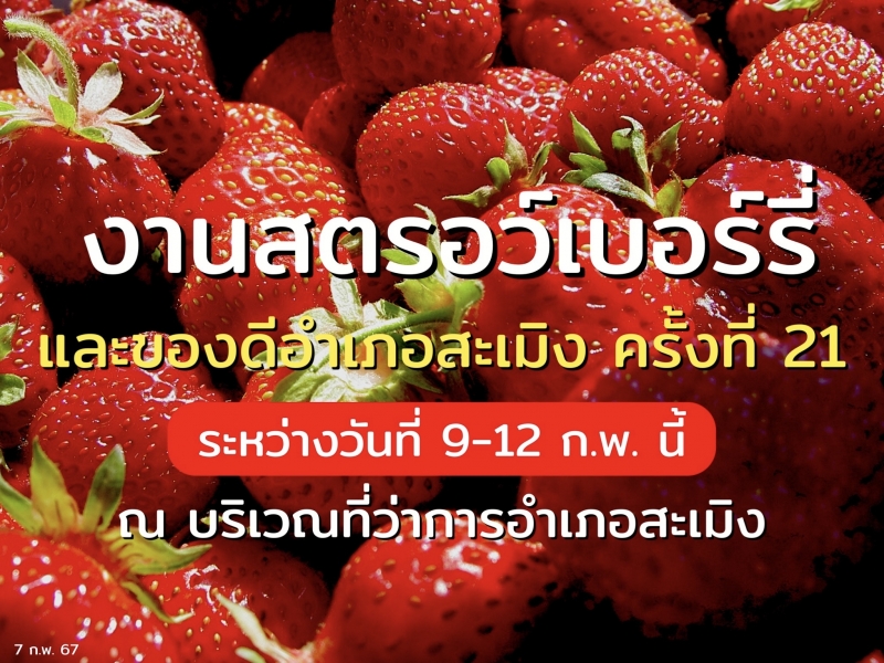 อำเภอสะเมิง ขอเชิญชวนนักท่องเที่ยวร่วมเที่ยวงานสตรอว์เบอร์รี่และของดีอำเภอสะเมิง ครั้งที่ 21 ระหว่างวันที่ 9-12 กุมภาพันธ์ นี้ เพื่อประชาสัมพันธ์และส่งเสริมการท่องเที่ยวของอำเภอสะเมิง จังหวัดเชียงใหม่