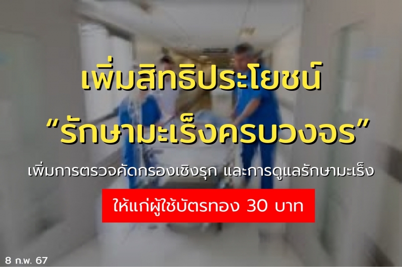 | • เพิ่มสิทธิประโยชน์ รักษามะเร็งครบวงจร เพิ่มการตรวจคัดกรองเชิงรุก และการดูแลรักษามะเร็ง ให้แก่ผู้ใช้บัตรทอง 30 บาท |