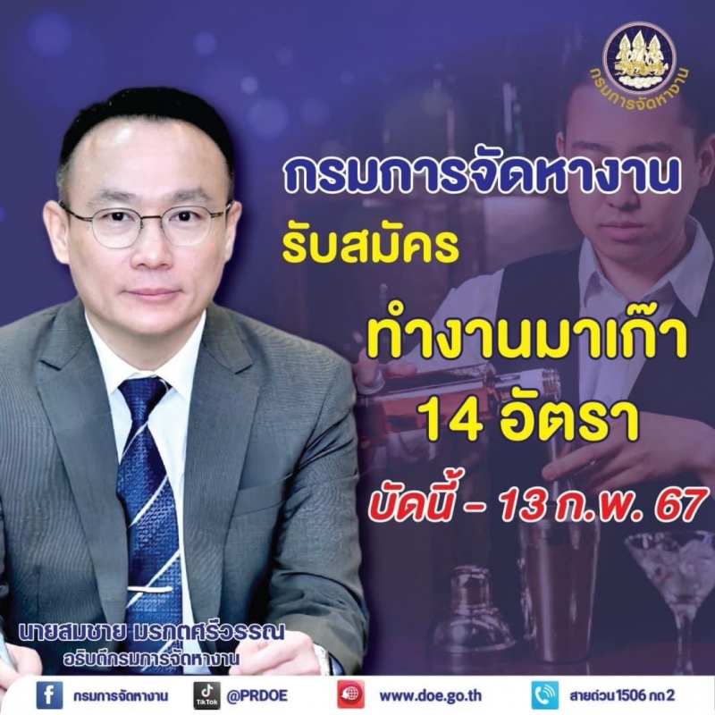 นายสมชาย มรกตศรีวรรณ อธิบดีกรมการจัดหางาน เปิดเผยว่า กรมการจัดหางานเปิดรับสมัครคนหางานเพื่อไปทำงานในเขตบริหารพิเศษมาเก๊ากับนายจ้างบริษัท Galaxy Entertainment Group ซึ่งประกอบกิจการโรงแรม คาสิโน และร้านอาหาร 4 ตำแหน่ง รวม 14 อัตรา ได้แก่ พนักงานต้อนรับลูกค้าวีไอพี 5 อัตรา พนักงานนวด 5 อัตรา  พนักงานฝ่ายต้อนรับวีไอพี 2 อัตรา และบาร์เทนเดอร์ 2 อัตรา เงินเดือนระหว่าง 49,396 - 68,725 บาท (อัตราแลกเปลี่ยน ณ วันที่ 7 กุมภาพันธ์ 2567 : 1 เหรียญมาเก๊า เท่ากับ 4.45 บาท) โดยนายจ้างจะจ่ายค่าโดยสารเครื่องบินจากกรุงเทพฯไปมาเก๊า และตั๋วขากลับหากทำงานครบตามสัญญาจ้าง จัดอาหารระหว่างเวลาที่ปฏิบัติหน้าที่ มีประกันสุขภาพและสวัสดิการตามกฎหมายแรงงานมาเก๊า ผู้สนใจสามารถยื่นใบสมัครทางอีเมล ได้ตั้งแต่บัดนี้จนถึงวันที่ 13 กุมภาพันธ์ 2567 โดยไม่เว้นวันหยุดราชการ (ยกเว้นวันที่ 13 กุมภาพันธ์ 2567 ยื่นภายในเวลา 16.00 น.)