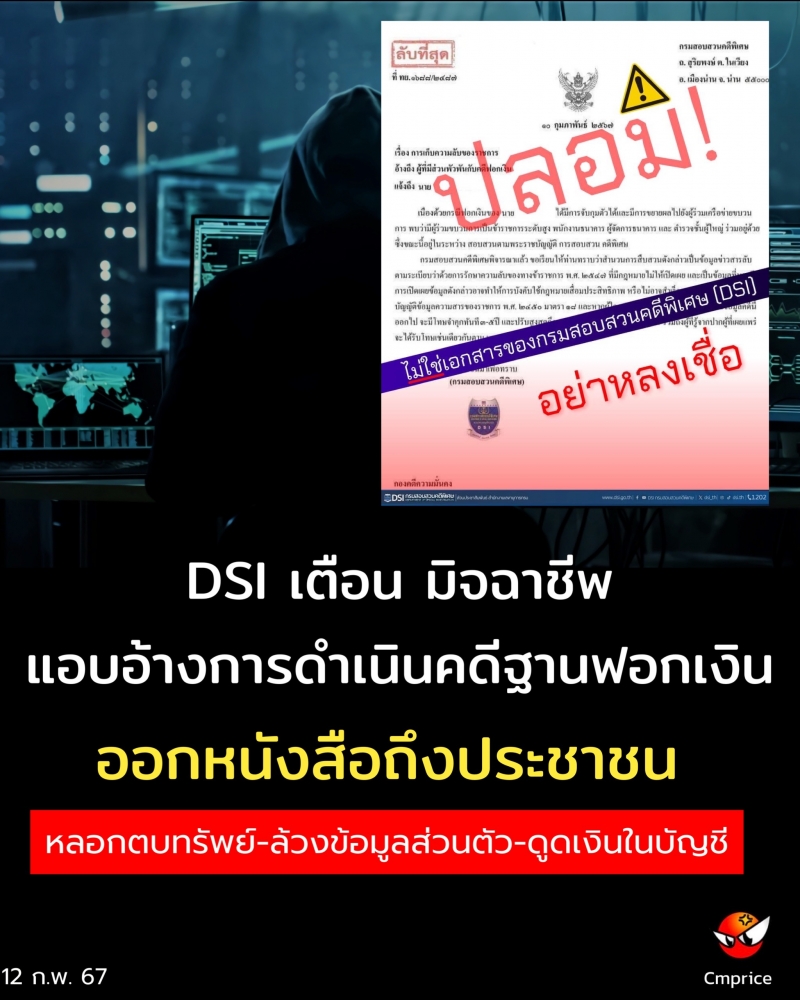 | • DSI เตือนภัย มิจฉาชีพแอบอ้างการดำเนินคดีฐานฟอกเงิน ออกหนังสือถึงประชาชน สุดท้ายหวังหลอกตบทรัพย์ ล้วงข้อมูลส่วนตัว ดูดเงินในบัญชี |