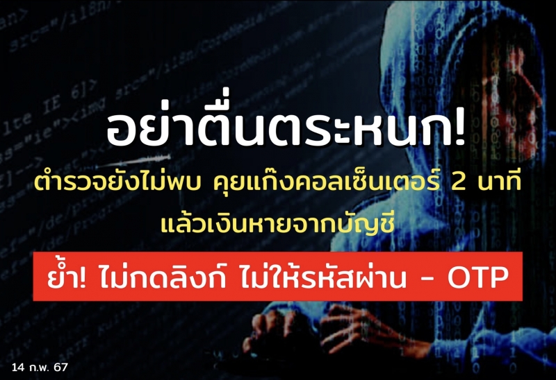 | • อย่าตื่นตระหนก! ตำรวจยังไม่พบ คุยแก๊งคอลเซ็นเตอร์ 2 นาทีแล้วเงินหายจากบัญชี ย้ำ! ไม่กดลิงก์ ไม่ให้รหัสผ่าน - OTP |