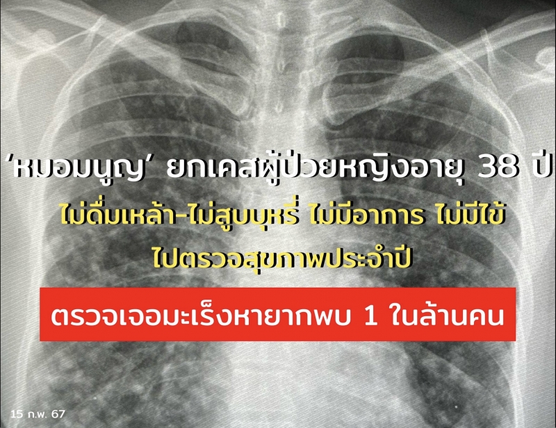 | • หมอมนูญ ยกเคสผู้ป่วยหญิงอายุ 38 ปี ไม่ดื่มเหล้า-ไม่สูบบุหรี่ ไม่มีอาการ ไม่มีไข้ ไปตรวจสุขภาพประจำปี ตรวจเจอมะเร็งหายากพบน้อยมากๆ 1 ในล้านคน |