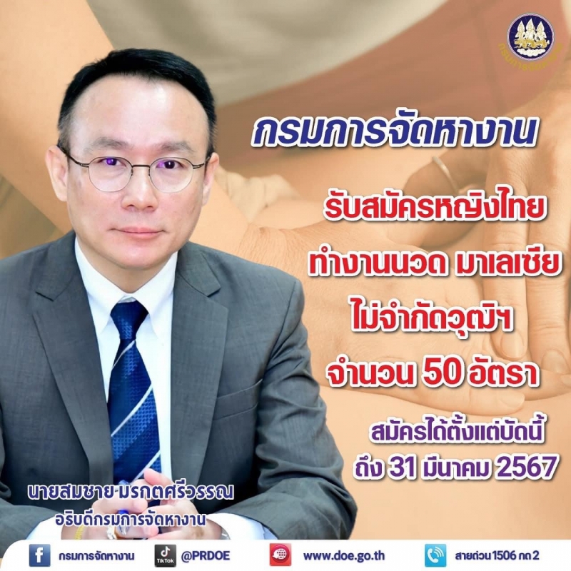 นายสมชาย มรกตศรีวรรณ อธิบดีกรมการจัดหางาน เปิดเผยว่า กระทรวงแรงงาน โดยกรมการจัดหางานเปิดรับสมัครคนหางานเพื่อไปทำงานกับนายจ้าง Thai Odyssey Sdn. Bhd. ประเทศมาเลเซีย (รอบที่ 2) ซึ่งประกอบกิจการร้านนวด ในตำแหน่งพนักงานนวด จำนวน 50 อัตรา ค่าจ้าง 3,000 ริงกิตต่อเดือน หรือประมาณ 22,195 บาท (ขึ้นกับอัตราแลกเปลี่ยน) มีระยะเวลาจ้างงาน 1 ปี โดยนายจ้างจะจัดหาที่พัก และจัดรถรับส่งไป-กลับ ระหว่างที่พัก-ที่ทำงาน จัดเตรียมอาหารให้วันละ 3 มื้อ จ่ายค่าตั๋วโดยสารเครื่องบินขาไป และค่ารถโดยสารประจำทางขากลับประเทศไทย เมื่อทำงานครบสัญญาจ้าง พร้อมประกันคุ้มครองการบาดเจ็บในระหว่างการทำงาน ประกันสุขภาพตามที่รัฐบาลประเทศมาเลเซียกำหนด และประกันสุขภาพแบบกลุ่ม โดยคุณสมบัติที่นายจ้างบริษัท Thai Odyssey Sdn. Bhd. แจ้งความต้องการ เป็นเพศหญิง อายุระหว่าง 21 - 44 ปี ไม่จำกัดวุฒิการศึกษา มีประสบการณ์ในการนวดไทย นวดเท้า โดยมีใบรับรองการฝึกอบรมการนวด อย่างน้อย 150 ชม. มีสุขภาพแข็งแรง ได้รับการตรวจสุขภาพกับโรงพยาบาลที่กำหนด