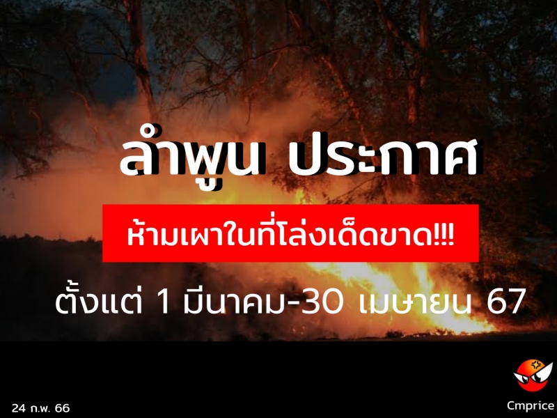 เพื่อเป็นการป้องกันภัยจากไฟป่า หมอกควัน และลดมลพิษทางอากาศที่จะเกิดขึ้น อาศัยอำนาจตามความในมาตรา 15 มาตรา 21 มาตรา 22 และมาตรา 29 แห่งพระราชบัญญัติป้องกันและบรรเทาสาธารณภัย พ.ศ. 2550 จังหวัดลำพูน จึงห้ามบุคคลทำการเผาในที่โล่ง ในพื้นที่จังหวัดลำพูน ตั้งแต่วันที่ 1 มีนาคม ถึง 30 เมษายน 2567 และประชาสัมพันธ์ให้ประชาชนทราบ ดังนี้
