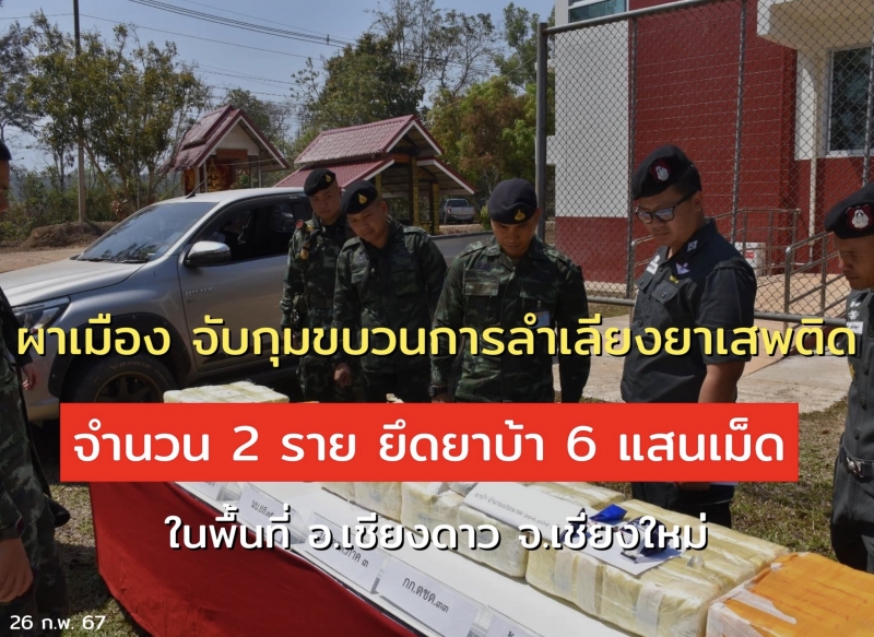เมื่อวันที่ 25 กุมภาพันธ์ 2567 เวลา 12.10 น. กองกำลังผาเมือง โดย พลตรีประพัฒน์ พบสุวรรณ ผู้บัญชาการกองกำลังผาเมือง มอบหมายให้ พันเอกไมตรี ศรีสันเทียะ เสนาธิการกองกำลังผาเมือง และส่วนราชการที่เกี่ยวข้อง ร่วมแถลงข่าว กรณี เมื่อวันที่ 25 กุมภาพันธ์ 2567 เวลา 04.40 น. กองร้อยทหารม้าที่ 2 หน่วยเฉพาะกิจไชยานุภาพ ร่วมกับ กองร้อยตำรวจตระเวนชายแดนที่ 335 จับกุมกลุ่มขบวนการลักลอบลำเลียงยาเสพติด บริเวณ เส้นทางบ้านหลวง-บ้านน้ำรู ตำบลเมืองนะ อำเภอเชียงดาว จังหวัดเชียงใหม่ ผลการปฏิบัติ สามารถจับกุมผู้ต้องหาได้จำนวน 2 ราย ยึดของกลางยาเสพติดให้โทษประเภท 1 (ยาบ้า) จำนวน 6 เป้ รวมทั้งสิ้น 600,000 เม็ด และรถยนต์กระบะ จำนวน 1 คัน หน่วยจึงได้นำของกลางส่งให้กับเจ้าหน้าที่ตำรวจสถานีตำรวจภูธรเชียงดาว เพื่อดำเนินการตามกฎหมายต่อไป