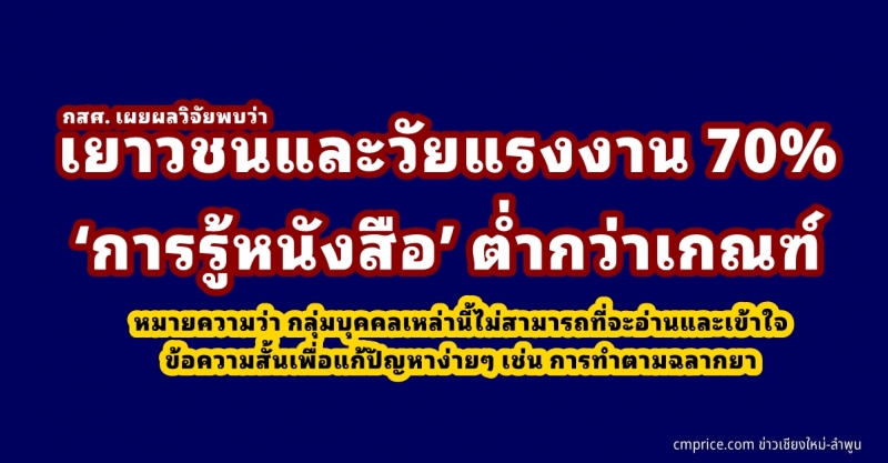 | • กสศ. เผยผลวิจัยพบว่า เยาวชนและวัยแรงงาน 70% การรู้หนังสือ ต่ำกว่าเกณฑ์ หมายความว่า กลุ่มบุคคลเหล่านี้ไม่สามารถที่จะอ่านและเข้าใจข้อความสั้นเพื่อแก้ปัญหาง่ายๆ เช่น การทำตามฉลากยา |