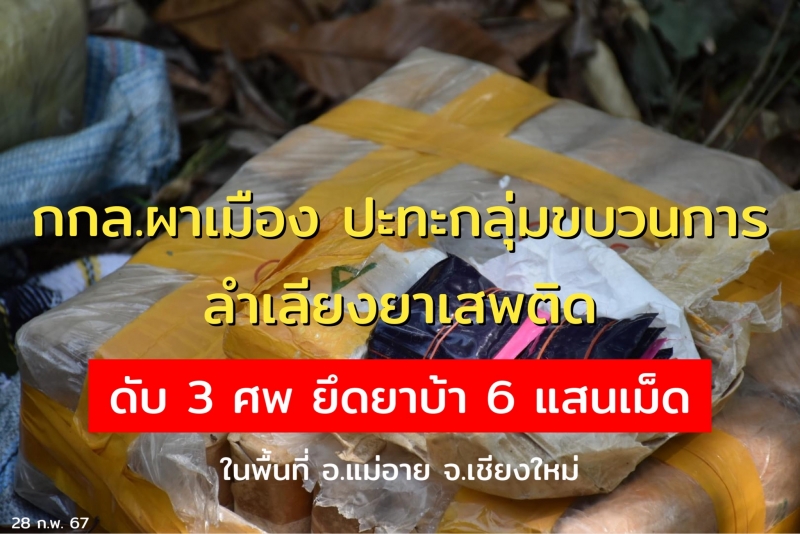 เมื่อวันที่ 27 กุมภาพันธ์ 2567 เวลา 1320 กองกำลังผาเมือง โดย พลตรีประพัฒน์ พบสุวรรณ ผู้บัญชาการกองกำลังผาเมือง และส่วนราชการที่เกี่ยวข้อง เข้าพื้นที่ตรวจสอบพื้นที่และร่วมแถลงข่าว กรณี เมื่อวันที่ 27 กุมภาพันธ์ 2567 เวลา 0800 กองบังคับการควบคุมทหารพรานศูนย์ปฏิบัติการกองทัพภาคที่ 3 โดย กองร้อยทหารพรานที่ 3207 จัดกำลังพล จำนวน 1 ชุดปฏิบัติการ ปฏิบัติภารกิจลาดตระเวนเฝ้าตรวจเพื่อป้องกันและสกัดกั้นการกระทำผิด ตามพระราชบัญญัติยาเสพติด ในพื้นที่รับผิดชอบ บริเวณ บ้านหล่ายอาย ตำบลแม่อาย อำเภอแม่อาย จังหวัดเชียงใหม่ ในระหว่างปฏิบัติหน้าที่ได้ตรวจพบกลุ่มบุคคลต้องสงสัย จำนวน 5 - 8 คน สะพายกระเป๋าเป้สัมภาระดัดแปลงเดินมาตามเส้นทางในภูมิประเทศเข้ามาในพื้นที่ดังกล่าว เจ้าหน้าที่จึงได้แสดงตัวเพื่อขอทำการตรวจค้น แต่บุคคลดังกล่าวได้ใช้ปืนไม่ทราบชนิดยิงใส่ฝ่ายเรา และเกิดการปะทะประมาณ 10 นาที ผลการปฏิบัติฝ่ายเราปลอดภัย และได้ทำการวางกำลังควบคุมพื้นที่เกิดเหตุ จากการตรวจสอบพบกลุ่มขบวนการเสียชีวิต จำนวน 3 ศพ ตรวจยึดยาเสพติดให้โทษประเภท 1 (ยาบ้า) ตราสัญลักษณ์ Y1 จำนวน 6 เป้ รวมทั้งสิ้น 600,000 เม็ด หน่วยจึงได้นำของกลางส่งให้กับเจ้าหน้าที่ตำรวจสถานีตำรวจภูธรแม่อาย เพื่อดำเนินการตามกฎหมายต่อไป