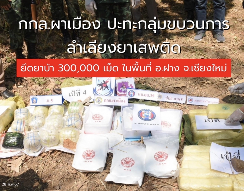 กกล.ผาเมือง ปะทะกลุ่มขบวนการลำเลียงยาเสพติด ยึดยาบ้า 300,000 เม็ด ในพื้นที่ อ.ฝาง จ.เชียงใหม่