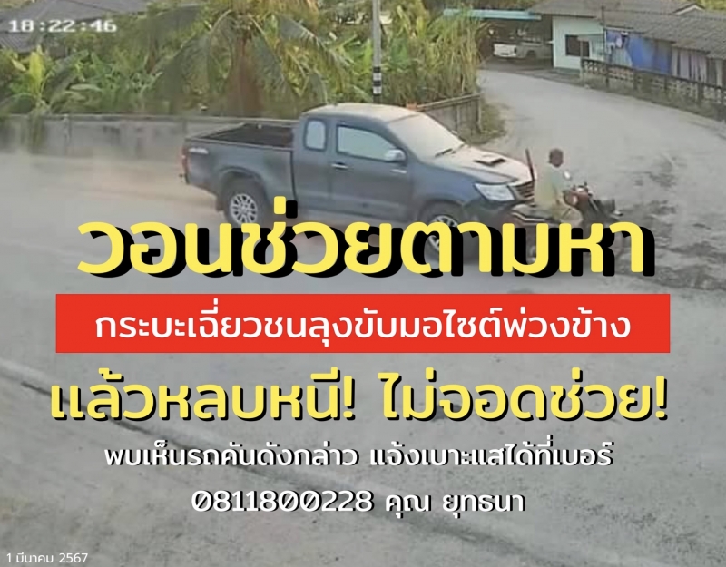 ที่ชนแล้วหนีบริเวณถนนเลียบคลองชลประทาน 4 แยก สะพานข้ามหมู่บ้านห้วยแก้ว ช่วงเวลา 18.22 น. วันที่ 28 กุมภาพันธ์ 2567 หลังจากชนแล้วหนี รถกระบะคันดังกล่าวขับมุ่งหน้าไปทางขัวดำ ตอนนี้ลุงอาการหนัก เลือดคลั่งในสมองและกระดูกซี่โครงหัก 3 ซี่ หากมีใครพบเห็นรถคันดังกล่าว สามารถติดต่อมาได้ที่เบอร์ 0811800228 คุณ ยุทธนา