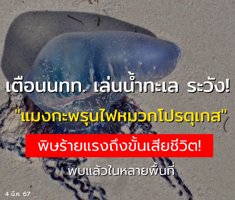 กรมควบคุมโรค ชี้ โปรดระวังแมงกะพรุนไฟหมวกโปรตุเกส หลังมีกระแสโซเชียลมีเดียพบแมงกะพรุนไฟหมวกโปรตุเกสบริเวณชายหาดหลายพื้นที่ และพบผู้ได้รับบาดเจ็บจากการถูกพิษแมงกะพรุนหลายราย ที่หาดชลาทัศน์ จ.สงขลา