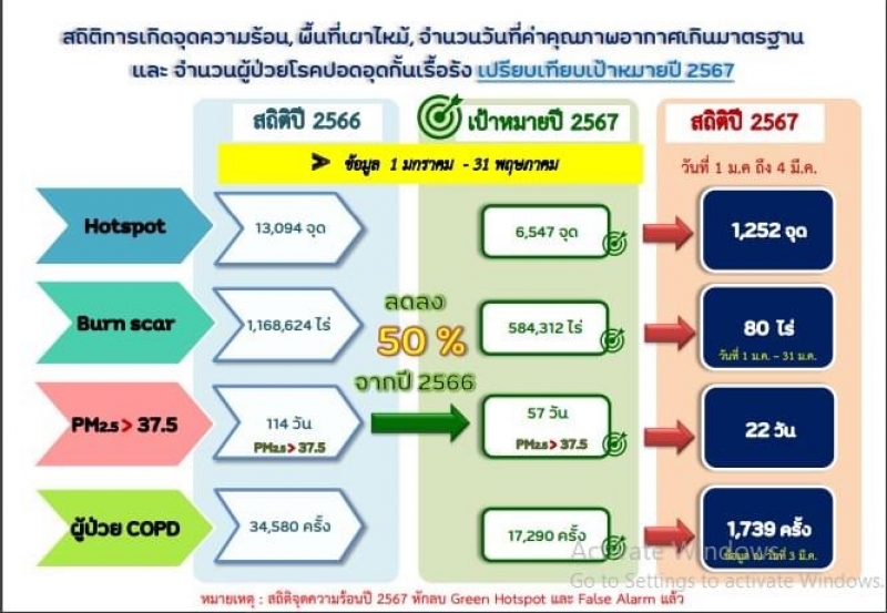 วันนี้ (5 มี.ค. 67) นายสมคิด ปัญญาดี ผู้อำนวยการส่วนยุทธศาสตร์ สำนักงานทรัพยากรธรรมชาติและสิ่งแวดล้อมจังหวัดเชียงใหม่ เปิดเผยถึงสถานการณ์ไฟป่าและแนวทางการดำเนินการป้องกันและแก้ไขปัญหาไฟป่าและฝุ่นละอองขนาดเล็ก PM 2.5 จังหวัดเชียงใหม่ ในปัจจุบัน ผ่านการแถลงข่าวสื่อมวลชนจังหวัดเชียงใหม่ โดยข้อมูลตั้งแต่วันที่ 1 มกราคม ถึง 4 มีนาคม 2567 จังหวัดเชียงใหม่ เกิดจุดความร้อนทั้งหมด 1,252 จุด พบพื้นที่เผาไหม้ 80 ไร่ มีจำนวนวันที่ค่าคุณภาพอากาศเกินมาตรฐานทั้งหมด 22 วัน และมีจำนวนผู้ป่วย COPD ที่เข้ารับการรักษา 1,739 ครั้ง แต่หากเปรียบเทียบตัวชี้วัดทั้ง 4 อย่างแล้ว ปีนี้พบว่าทุกตัวชี้วัดลดลงมากถึง 50 เปอร์เซ็นต์ เมื่อเทียบกับปี 2566