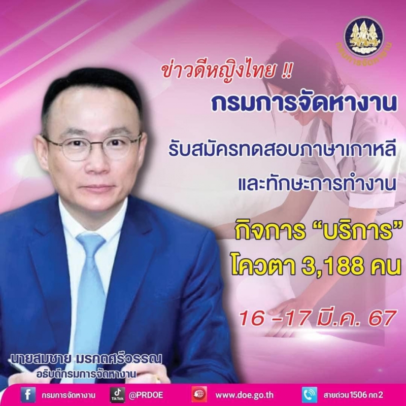 นายสมชาย มรกตศรีวรรณ อธิบดีกรมการจัดหางาน เปิดเผยว่า กรมการจัดหางานประกาศรับสมัครทดสอบภาษาเกาหลีและทักษะการทำงาน (Point System) ครั้งที่ 14 รอบที่ 2 ประเภทกิจการบริการ (เพศหญิง) เพื่อสมัครไปทำงานสาธารณรัฐเกาหลีตามระบบการจ้างแรงงานต่างชาติ (EPS) ในโรงแรม รีสอร์ทคอนโดมิเนียม ที่พักทั่วไปและร้านอาหารเกาหลี โดยในรอบนี้ได้รับโควตาผู้สอบผ่าน จำนวน 3,188 คน ผู้สนใจสามารถสมัครผ่านเว็บไซต์กองบริหารแรงงานไทยไปต่างประเทศ toea.doe.go.th ระหว่างวันที่ 16 - 17 มีนาคม 2567 ตลอด 24 ชั่วโมง ซึ่งภายหลังจากดำเนินการทดสอบเสร็จสิ้น จะประกาศรายชื่อผู้ที่มีคะแนนรวมสูงสุดลงมาจนครบจำนวนที่กำหนดตามโควตา และผู้มีรายชื่อตามประกาศดังกล่าวจะมีสิทธิยื่นใบสมัครไปทำงานสาธารณรัฐเกาหลีตามระบบฯ พร้อมขึ้นทะเบียนไว้ 2 ปี นับแต่วันประกาศผลการทดสอบ