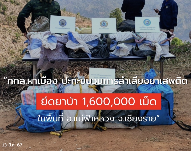 กกล.ผาเมือง ปะทะกลุ่มขบวนการลำเลียงยาเสพติด ยึดยาบ้า 1,600,000 เม็ด ในพื้นที่ อ.แม่ฟ้าหลวง จ.เชียงราย