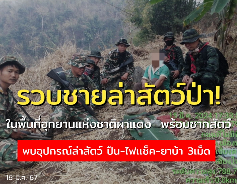 เมื่อวันที่ 15 มีนาคม 2567 ตั้งแต่เวลา 14.00 น. คณะพนักงานเจ้าหน้าที่อุทยานแห่งชาติผาแดง นำโดย นายประกาศิต ระวิวรรณ นักวิชาการป่าไม้ชำนาญการพิเศษ หัวหน้าอุทยานแห่งชาติผาแดง เจ้าหน้าที่สายตรวจส่วนกลางอุทยานแห่งชาติผาแดง เจ้าหน้าที่ทหาร ร17 พัน 3 ร่วมกันออกตรวจปราบปรามการกระทำผิดกฎหมายว่าด้วยการป่าไม้ ทำการลาดตระเวณและตั้งจุดสะกัดในพื้นที่เสี่ยงเพื่อกดดันกลุ่มผู้มีพฤติกรรมล่าสัตว์ป่า และเผาป่า ในเขตอุทยานแห่งชาติผาแดง