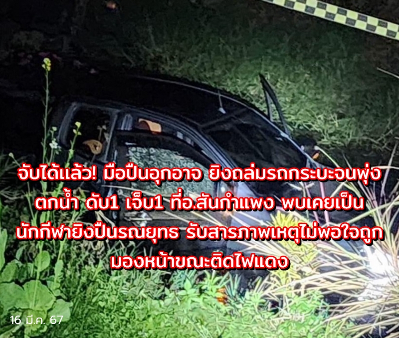 | • จับได้เเล้ว! มือปืนอุกอาจ ยิงถล่มรถกระบะจนพุ่งตกน้ำ ดับ1 เจ็บ1 ที่อ.สันกำแพง พบเคยเป็นนักกีฬายิงปืนรณยุทธ รับสารภาพเหตุไม่พอใจถูกมองหน้าขณะติดไฟแดง |