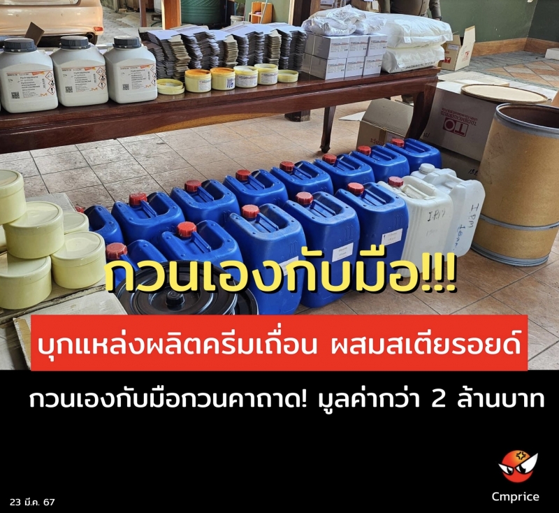 จุดที่ 1 สถานที่ผลิต พบ นาย เฉลียว (สงวนนามสกุล) อายุ 68 ปี ซึ่งเป็นเจ้าบ้าน เป็นผู้นำตรวจค้น โดยสถานที่ดังกล่าวสถานที่ดังกล่าวใช้พื้นที่ภายในบ้านในการจัดเก็บและผลิตเครื่องสำอางสำหรับทาผิวหน้าและผิวกาย โดยผสมส่วนผสมต่างๆ ด้วยมือมนุษย์ และอุปกรณ์ในการผลิตที่ไม่มีสุขอนามัย