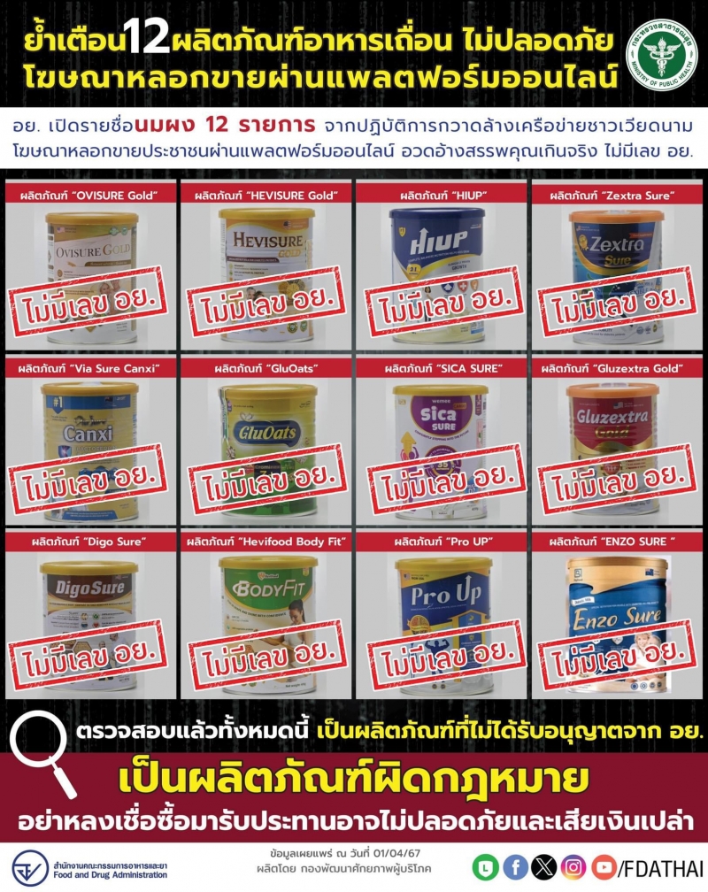 สำนักงานคณะกรรมการอาหารและยา (อย.) ร่วมกับกองกำกับการ 4 กองบังคับการปราบปรามการกระทำความผิดเกี่ยวกับการคุ้มครองผู้บริโภค กวาดล้างเครือข่ายทุนเวียดนาม หลอกขายนมหลากหลายยี่ห้อ โฆษณาอวดอ้างสรรพคุณแบบโอเวอร์ ผ่านแพลตฟอร์มออนไลน์ในราคาแพง อย่าหลงซื้อ อย่ากิน รีบทิ้ง หวั่นได้รับอันตราย