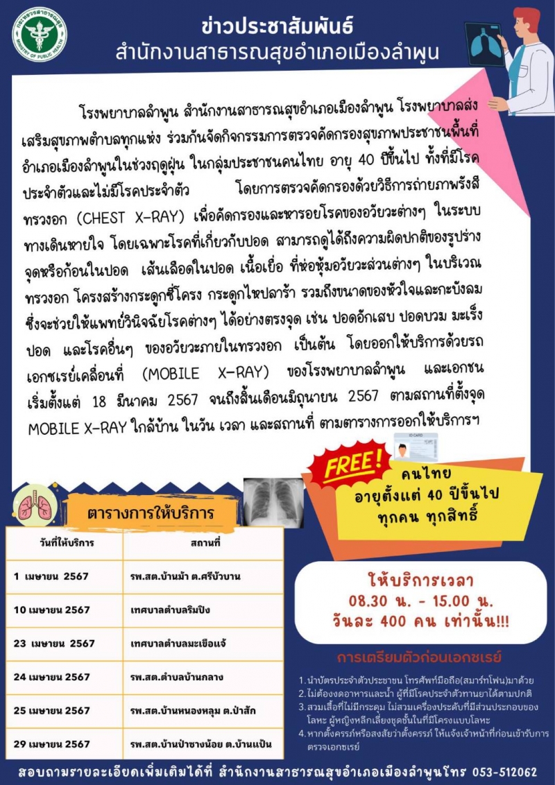 ด้วย โรงพยาบาลลำพูน สำนักงานสาธารณสุขอำเภอเมืองลำพูน โรงพยาบาลส่งเสริมสุขภาพตำบลทุกแห่ง ร่วมกันจัดกิจกรรมการตรวจคัดกรองสุขภาพประชาชนในพื้นที่อำเภอเมืองลำพูน ในช่วงฤดูฝุ่น ในกลุ่มประชาชนคนไทย อายุ 40 ปีขึ้นไป ทั้งที่มีโรคประจำตัว และไม่มีโรคประจำตัว โดยการตรวจคัดกรองด้วยวิธีการถ่ายภาพรังสีทรวงอก(Chest X-ray) เป็นการตรวจบริเวณทรวงอกด้วยการฉายรังสีเอกซ์ เพื่อคัดกรองและหารอยโรคของอวัยวะต่างๆ ในระบบทางเดินหายใจ โดยเฉพาะโรคที่เกี่ยวกับปอด สามารถดูได้ถึงความผิดปกติของรูปร่าง จุดหรือก้อนในปอด เส้นเลือดในปอด เนื้อเยื่อที่ห่อหุ้มอวัยวะส่วนต่างๆ ในบริเวณทรวงอก โครงสร้างกระดูกซี่โครง กระดูกไหปลาร้า รวมถึงขนาดของหัวใจและกะบังลม ซึ่งจะช่วยให้แพทย์วินิจฉัยโรคต่างๆ ได้อย่างตรงจุด เช่น ปอดอักเสบ ปอดบวม มะเร็งปอด และโรคอื่นๆ ของอวัยวะภายในทรวงอก เป็นต้น โดยออกให้บริการด้วยรถเอกซเรย์เคลื่อนที่ (Mobile X – Ray) ของโรงพยาบาลลำพูน ฟรี คนไทยทุกคน ทุกสิทธิ์ ดังนี้