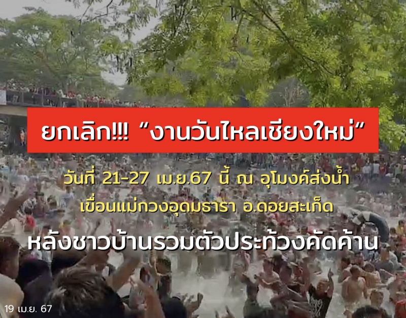แต่ปรากฎว่าเมื่อช่วงเช้าวันที่ 19 เม.ย.2567 นี้มีผู้คัดค้าน จำนวนหนึ่งรวมตัวกันเข้ายื่นต่อนายอำเภอดอยสะเก็ด เพื่อระงับการจัดงานวันไหลเชียงใหม่ ระหว่างวันที่ 21-27 เม.ย.2567 นี้เสีย