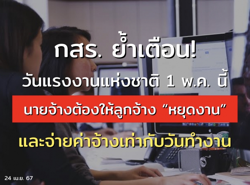 กสร. จึงขอฝากย้ำเตือนไปยังนายจ้าง สถานประกอบกิจการให้ปฏิบัติตามกฎหมายอย่างเคร่งครัด โดยจัดให้ลูกจ้างได้หยุดงานในวันแรงงานแห่งชาติและจ่ายค่าจ้างให้แก่ลูกจ้างเท่ากับค่าจ้างในวันทำงาน กรณีที่วันแรงงานแห่งชาติตรงกับวันหยุดประจำสัปดาห์ของลูกจ้าง ให้ลูกจ้างได้หยุดชดเชยวันหยุดตามประเพณีในวันทำงานถัดไป สำหรับกรณีที่นายจ้างไม่อาจให้ลูกจ้างหยุดงานในวันดังกล่าวได้เนื่องจากลูกจ้างทำงานในกิจการโรงแรม สถานมหรสพ ร้านขายอาหาร ร้านขายเครื่องดื่ม สโมสร สมาคม สถานพยาบาลและสถานบริการการท่องเที่ยว งานในป่า งานในที่ทุรกันดาร งานขนส่ง และงานที่มีลักษณะงานหรือสภาพของงานต้องทำติดต่อกันไปถ้าหยุดจะเสียหายแก่งานนั้น ให้นายจ้างตกลงกับลูกจ้างว่าจะหยุดชดเชยในวันอื่นแทนหรือให้นายจ้างจ่ายค่าทำงานในวันหยุดให้ก็ได้