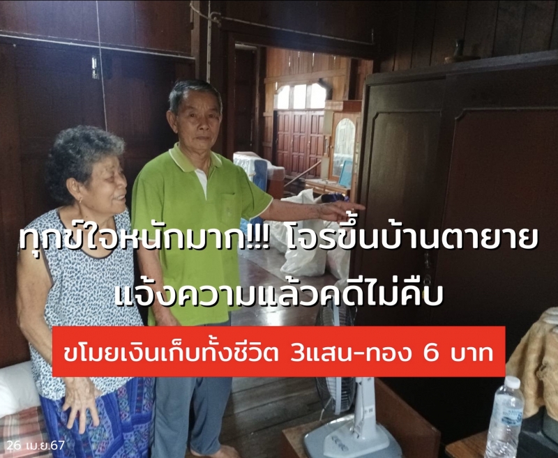 เมื่อวันที่ 15 เม.ย.67 คุณตาสิงห์ธาร อายุ79 ปี และภรรยาชาวบ้านแจ่ม ต.มะเขือแจ้ จ.ลำพูน ถูกโจรขึ้นบ้านขโมยเงินเก็บทั้งชีวิต 3แสนบาท (แบงค์พันแบบเก่า -ใบใหญ่) และสร้อยคอทองคำ 3 บาท จำนวน 2 เส้น (จี้ ร.5) รวมมูลค่ากว่า 540,000 บาท