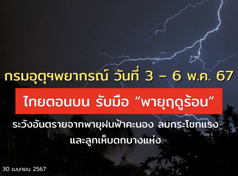 ส่วนในช่วงวันที่ 3 – 6 พ.ค. 67 ขอให้ประชาชนบริเวณประเทศไทยตอนบนระวังอันตรายจากพายุฝนฟ้าคะนอง ลมกระโชกแรง และลูกเห็บตกบางแห่ง รวมถึงฟ้าผ่าที่อาจจะเกิดขึ้นได้บางพื้นที่ โดยหลีกเลี่ยงการอยู่ในที่โล่งแจ้ง ใต้ต้นไม้ใหญ่ สิ่งปลูกสร้าง และป้ายโฆษณาที่ไม่แข็งแรง สำหรับเกษตรกรควรเตรียมการป้องกันและระวังความเสียหายที่จะเกิดต่อผลผลิตทางการเกษตรและอันตรายต่อสัตว์เลี้ยง สำหรับชาวเรือควรหลีกเลี่ยงการเดินเรือในบริเวณที่มีฝนฟ้าคะนองไว้ด้วย