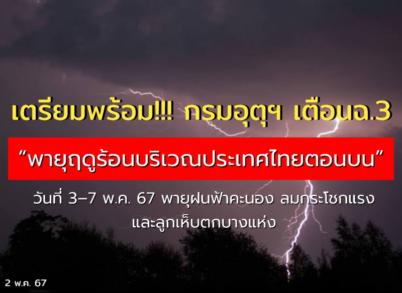 ในช่วงวันที่ 3–5 พ.ค. 67 คลื่นกระแสลมฝ่ายตะวันตกจากประเทศเมียนมาจะเคลื่อนผ่านภาคเหนือตอนบนและภาคตะวันออกเฉียงเหนือตอนบน ส่วนในช่วงวันที่ 6-7 พ.ค. 67 จะมีแนวพัดสอบของลมตะวันออกเฉียงใต้และลมใต้พัดปกคลุมบริเวณภาคตะวันออกเฉียงเหนือ ภาคตะวันออก ภาคกลาง และภาคเหนือตอนล่าง ในขณะที่ประเทศไทยตอนบนมีอากาศร้อนถึงร้อนจัด ทำให้บริเวณดังกล่าวมีพายุฤดูร้อนเกิดขึ้นหลายพื้นที่ โดยมีลักษณะของพายุฝนฟ้าคะนอง ลมกระโชกแรง และลูกเห็บตกบางแห่ง รวมถึงอาจมีฟ้าผ่าเกิดขึ้นได้ ขอให้ประชาชนบริเวณประเทศไทยตอนบนระวังอันตรายจากพายุฤดูร้อน โดยหลีกเลี่ยงการอยู่ในที่โล่งแจ้ง ใต้ต้นไม้ใหญ่ สิ่งปลูกสร้าง และป้ายโฆษณาที่ไม่แข็งแรง สำหรับเกษตรกรควรเตรียมการป้องกันและระวังความเสียหายที่จะเกิดต่อผลผลิตทางการเกษตรและอันตรายต่อสัตว์เลี้ยงไว้ด้วย