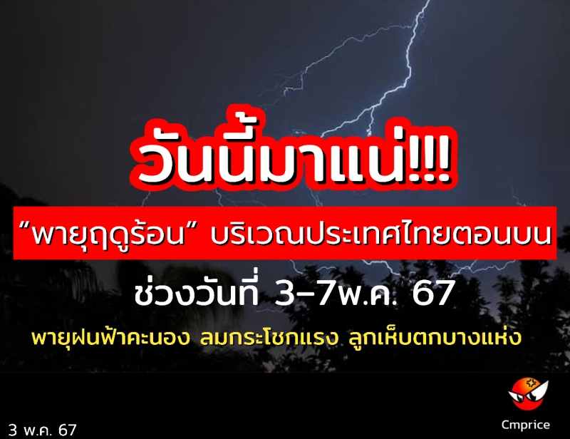 ในช่วงวันที่ 3–5 พ.ค. 67 คลื่นกระแสลมฝ่ายตะวันตกจากประเทศเมียนมาจะเคลื่อนผ่านภาคเหนือตอนบนและภาคตะวันออกเฉียงเหนือตอนบน ส่วนในช่วงวันที่ 6-7 พ.ค. 67 จะมีแนวพัดสอบของลมตะวันออกเฉียงใต้และลมใต้พัดปกคลุมบริเวณภาคตะวันออกเฉียงเหนือ ภาคตะวันออก ภาคกลาง และภาคเหนือตอนล่าง ในขณะที่ประเทศไทยตอนบนมีอากาศร้อนถึงร้อนจัด ทำให้บริเวณดังกล่าวมีพายุฤดูร้อนเกิดขึ้นหลายพื้นที่ โดยมีลักษณะของพายุฝนฟ้าคะนอง ลมกระโชกแรง และลูกเห็บตกบางแห่ง รวมถึงอาจมีฟ้าผ่าเกิดขึ้นได้ ขอให้ประชาชนบริเวณประเทศไทยตอนบนระวังอันตรายจากพายุฤดูร้อน โดยหลีกเลี่ยงการอยู่ในที่โล่งแจ้ง ใต้ต้นไม้ใหญ่ สิ่งปลูกสร้าง และป้ายโฆษณาที่ไม่แข็งแรง สำหรับเกษตรกรควรเตรียมการป้องกันและระวังความเสียหายที่จะเกิดต่อผลผลิตทางการเกษตรและอันตรายต่อสัตว์เลี้ยงไว้ด้วย