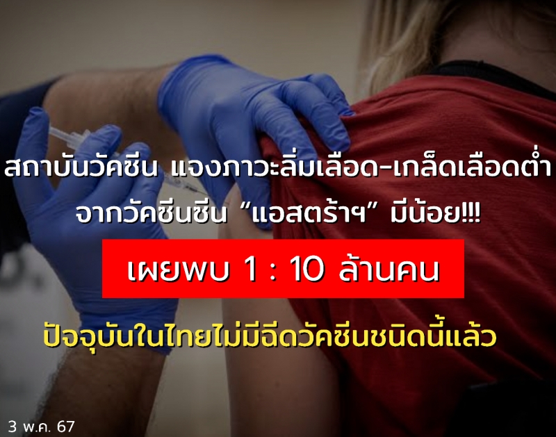 เมื่อวันที่ 2 พฤษภาคม 2567 สถาบันวัคซีนแห่งชาติชี้แจงข้อเท็จจริงเรื่อง ภาวะลิ่มเลือดร่วมกับภาวะเกล็ดเลือดต่ำ (Thrombosis with thrombocytopenia syndrome, TTS) ภายหลังการได้รับวัคซีนโควิด 19 ของบริษัท แอสตร้าเซนเนก้า โดยมีรายละเอียดดังนี้