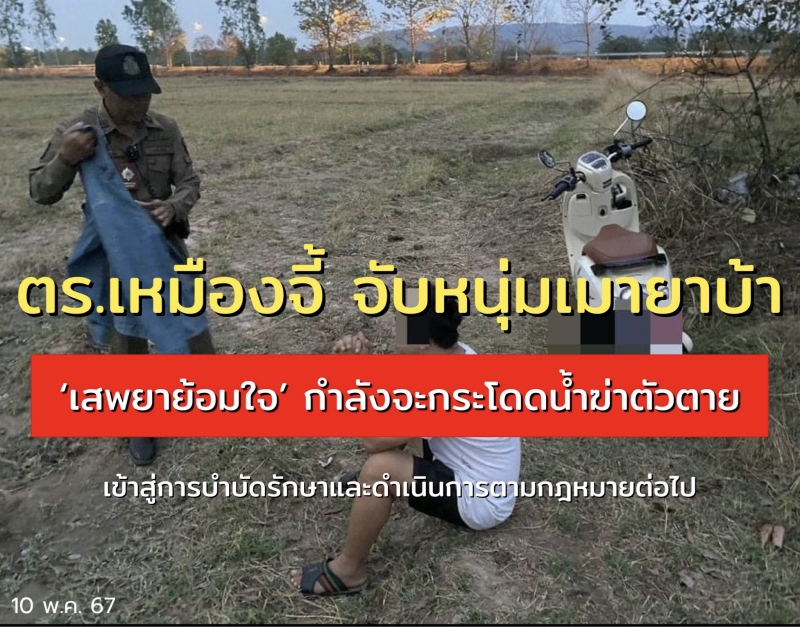 จึงได้เดินทางไปตรวจสอบพบชายต้องสงสัยมีลักษณะตามที่ได้รับแจ้งขับรถ จยย. ไปตามถนนสายบ้านห้วยม้าโก้ง-บ้านหนองปัง จึงได้ติดตามไป พบว่าได้ขับรถ จยย.ไปจอดที่ถนนข้างหนองน้ำกลางทุ่งนา จึงได้ติดตามไป แล้วแสดงตนเป็น เจ้าพนักงานตำรวจ สอบถาม รับว่าได้เสพยาบ้าย้อมใจมากำลังจะกระโดดน้ำฆ่าตัวตาย ขอตรวจค้นตัวพบยาบ้า จำนวน 1 เม็ด พร้อมอุปกรณ์การเสพ จำนวน 1 ชุด จึงจับกุมข้อหา เป็นผู้ขับขี่รถในขณะมีสารเสพติดในร่างกาย, เสพ และมียาเสพติดให้โทษประเภท 1 (ยาบ้าหรือเมทแอมเฟตามีน)โดยผิดกฎหมาย นำตัวพร้อมของกลาง ส่ง พงส.สภ.เหมืองจี้ เข้าสู่กระบวนการบำบัดรักษาและ ดำเนินการตามกฎหมายต่อไป