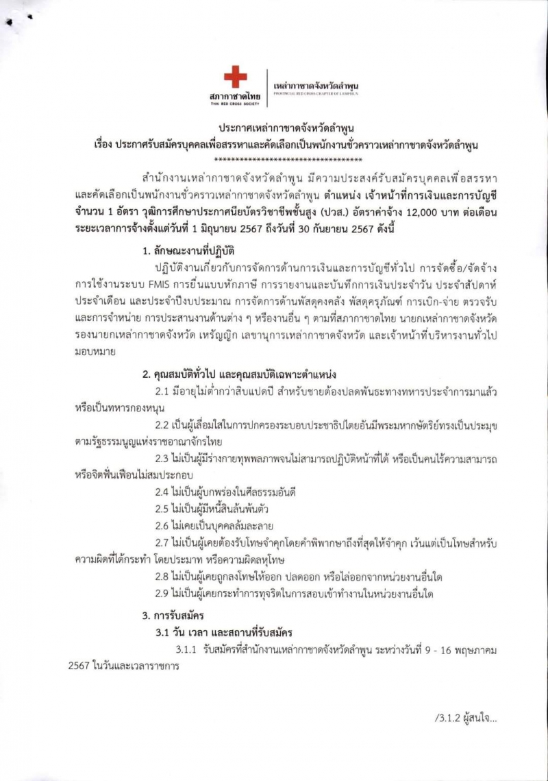รับสมัครบุคคลเพื่อสรรหาและคัดเลือกเป็นพนักงานชั่วคราวเหล่ากาชาดจังหวัดลำพูน ตำแหน่ง เจ้าหน้าที่การเงินและการบัญชี