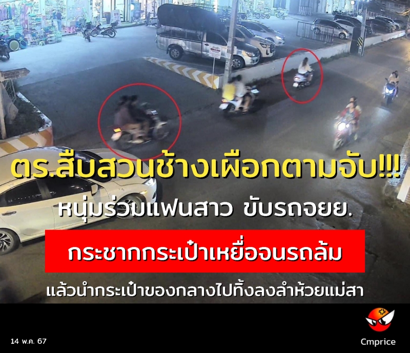 | • ตร.สืบสวนช้างเผือกจับหนุ่มร่วมแฟนสาว ขับรถ จยย. กระชากกระเป๋าเหยื่อจนรถล้ม แล้วนำกระเป๋าของกลางไปทิ้งลงลำห้วยแม่สา |