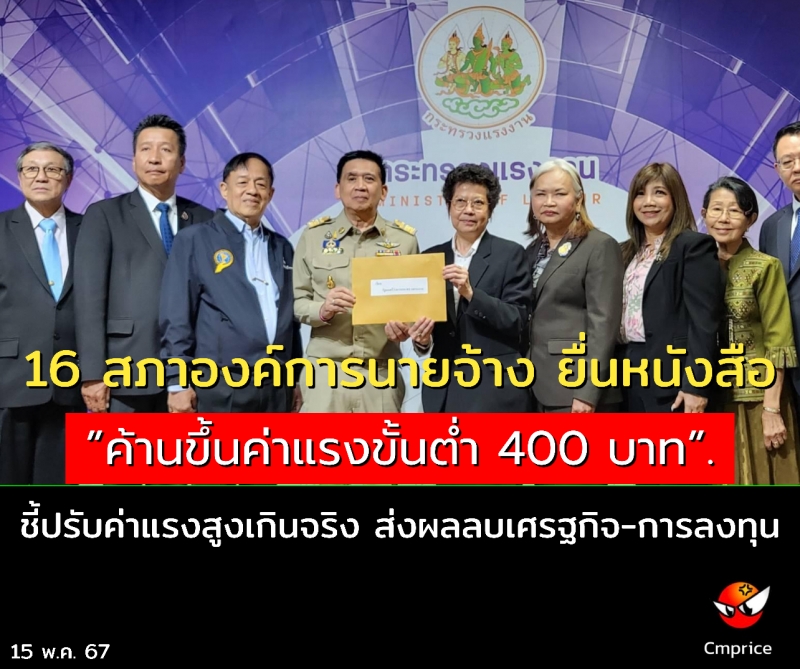 | • 16 สภาองค์การนายจ้าง ยื่นหนังสือค้านขึ้นค่าแรงขั้นต่ำ 400 บาท ชี้ปรับค่าแรงสูงเกินจริง ส่งผลลบเศรฐกิจ-การลงทุน |