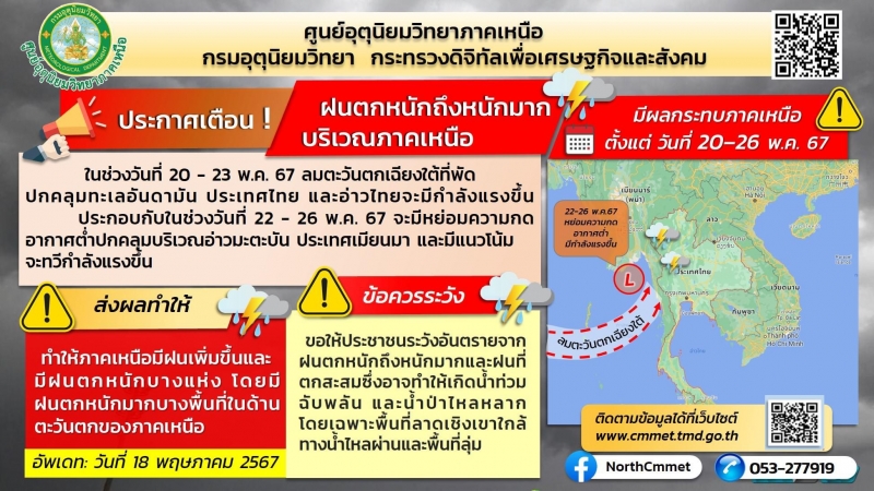 | • กรมอุตุฯเตือน! ภาคเหนือ ฝนตกหนักถึงหนักมาก วันที่ 20-26 พ.ค. 67 |